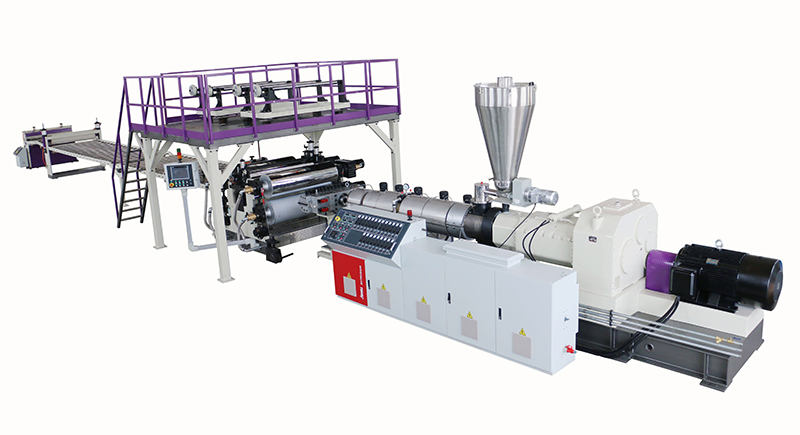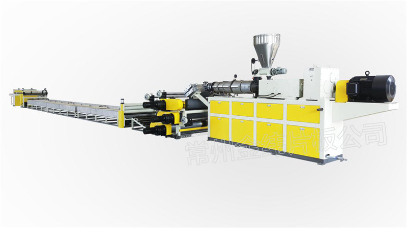 Second: SPC composite board extrusion line. SPC board is made up by the PVC foundation layer material, the four roller machine makes the PVC film layer, PVC anti-friction layer and PVC bottom layer pressed together. This product can be made one time. The four layers are formed by heat not glue, which makes this board environment friendly without heavy metal and formaldehyde.